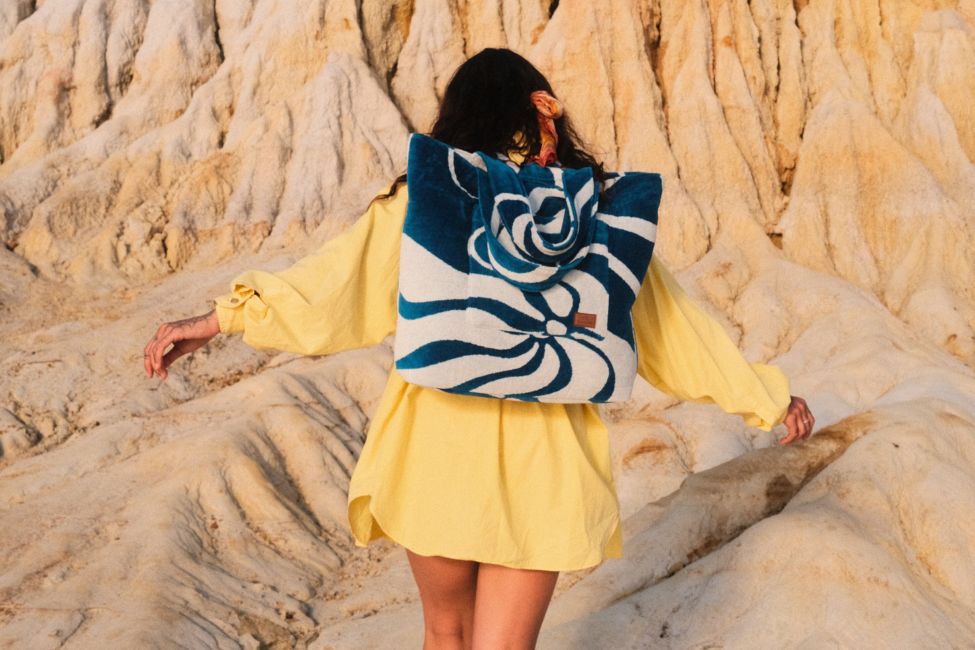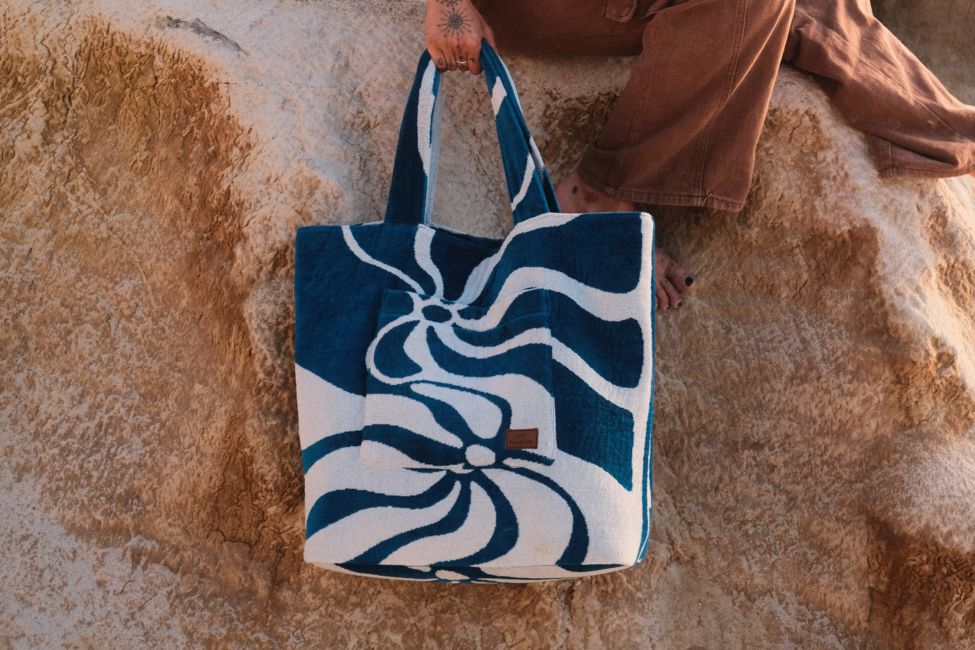 A statement in simplicity. The Drift Towelling Bundle brings together our plush 600 GSM cotton towel with the matching towelling beach bag, both featuring the fluid blue and bone white design inspired by water meeting sand.